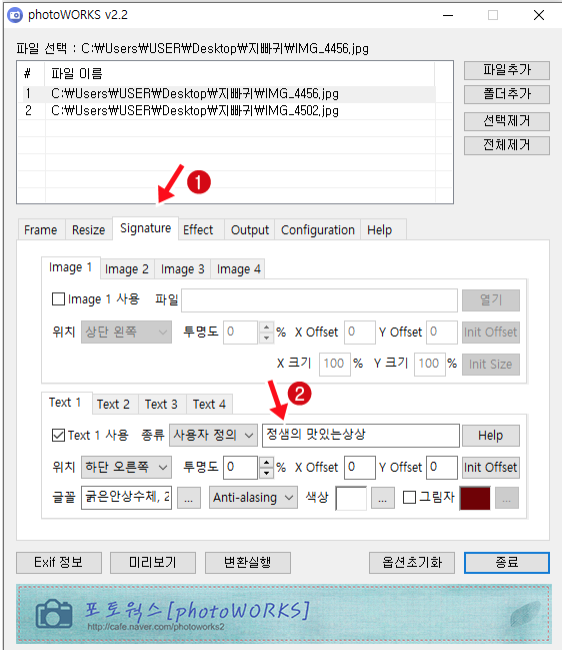 5. 포토윅스의 장점을 꼽자면 바로 signature 기능이 있습니다. 이 기능은 워터마크를 일괄적으로 적용 가능하기 때문에 사진도용을 방지 할수 있는 기능이 되겠습니다.