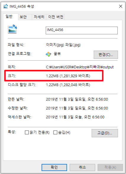 8. 이렇게 변환된 파일을 열어 보았습니다. 기존 5400픽셀 12mb 였던 사진 파일 크기가 1.2mb 로 약 1/10사이즈로 줄어든것을 확인할수 있습니다.