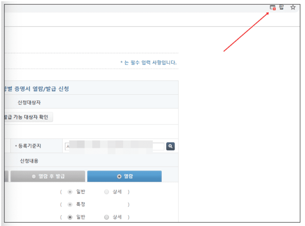 가족관계증명서를 모니터로만 보고 출력하고 싶지 않을경우 꼭 팝업을 차단해 주어야 합니다. (위사진은 크롬 사용일경우)