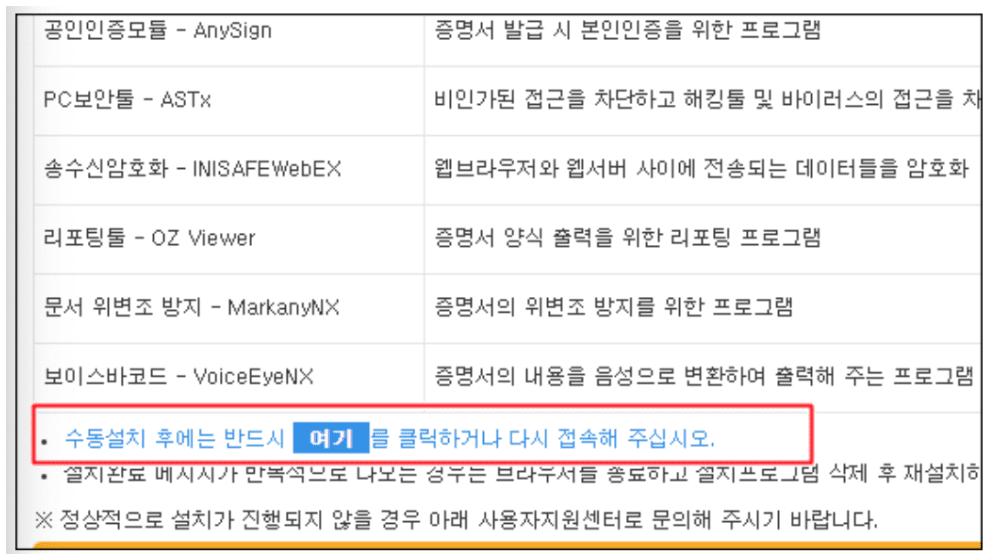 4. 프로그램 설치가 모두 끝나면 위 빨간상자안 [여기]를 클릭해 재접속 합니다